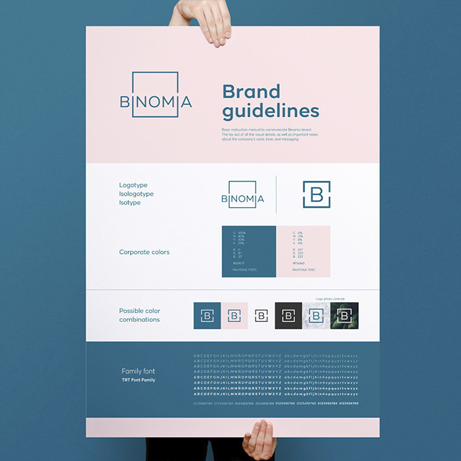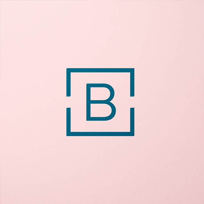 La identidad visual cobra vida a través de un sistema modular, donde el isotipo encapsula la «B» en un marco estructural que simboliza orden y enfoque. La paleta cromática, compuesta por un azul profundo y un rosa pálido, crea un balance entre profesionalismo y cercanía. La tipografía moderna y limpia aporta claridad y sofisticación a la comunicación.